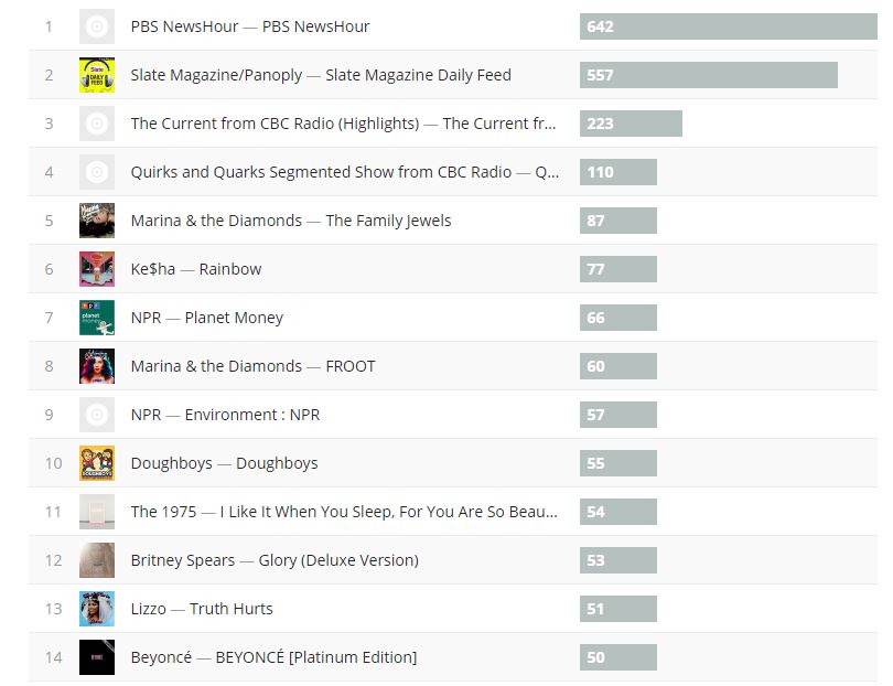 This is the third in a set of three end-of-year 2017 music stats posts. To see my top songs go here and to see my top artists go here. I keep track of every track and podcast episode I listen to on Itunes, my Ipods, Spotify, YouTube, etc. by way of Last.fm scrobbling.